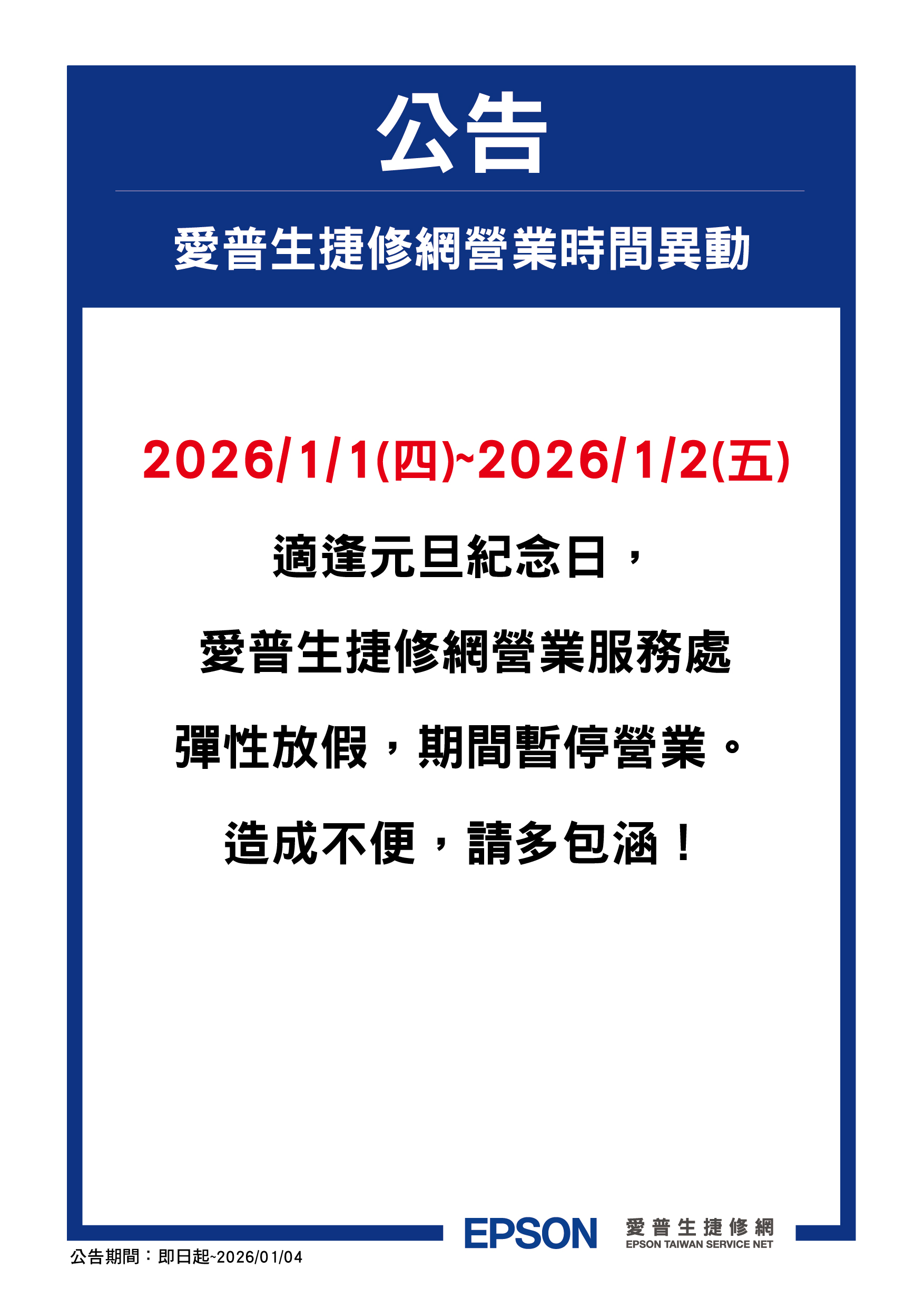 【公告】2026/1/1~2026/1/2 愛普生捷修網彈性放假,期間暫停營業